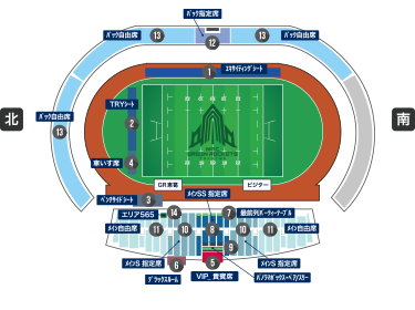 会場全体を広い視野で見渡せ、ゲーム展開を俯瞰して楽しめるメインスタンド中央部の座席です。前方エリアの席はグラウンドに近く、選手同士のやり取りが聞こえるほどの臨場感を味わえます。後方エリアの席は雨に濡れにくく、雨天時の観戦も安心です。試合だけでなく、キックオフ前のイベントやチアのパフォーマンスも正面からお楽しみいただけます。