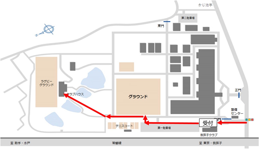 〈アクセス〉常磐線天王台駅北口より、徒歩約20分またはバス約5分。NEC我孫子事業場副門側にて受付がございます。受付よりグラウンドまで徒歩約7分かかります。