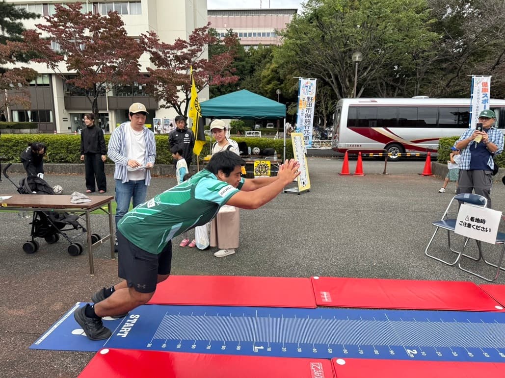 10月19日(日)、NECグリーンロケッツ東葛のホストタウンである野田市で行われた野田市産業祭に、亀山選手が参加しました。参加選手亀山昇太郎選手 ラグビーボールでのパスターゲットで、子ども達に優しく教えてあげる亀山選手!体力測定では、体重が115kgあるにも関わらず、ジャンプ力がダントツNo1だった亀山選手に周りの皆さんは驚かれておりました!
