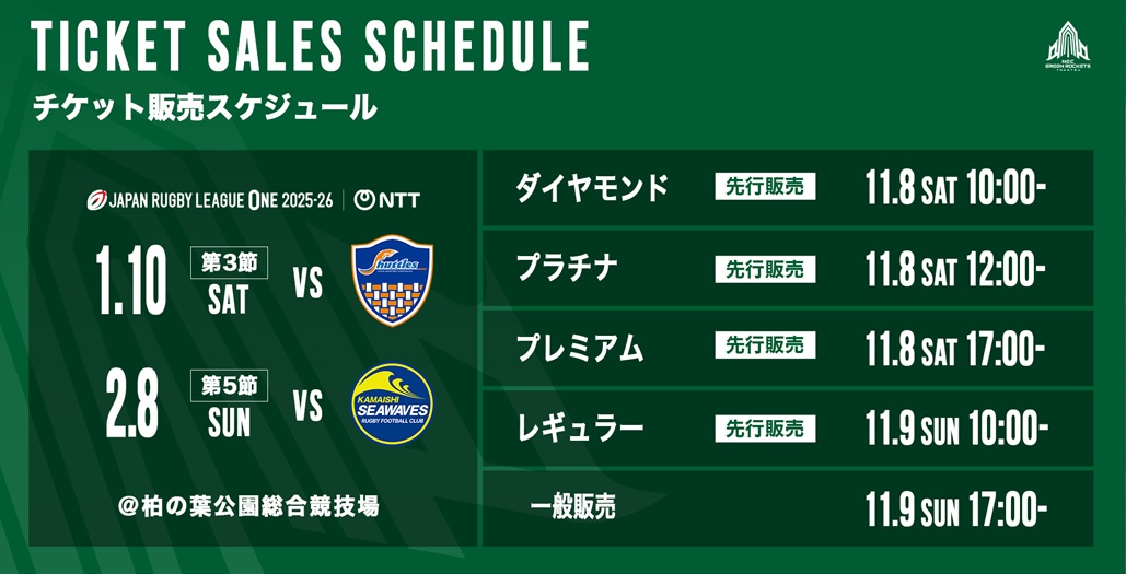 11月8日(土)より、以下第3節・第5節 柏の葉ホストゲームのチケットを順次販売開始いたしますのでお知らせいたします。