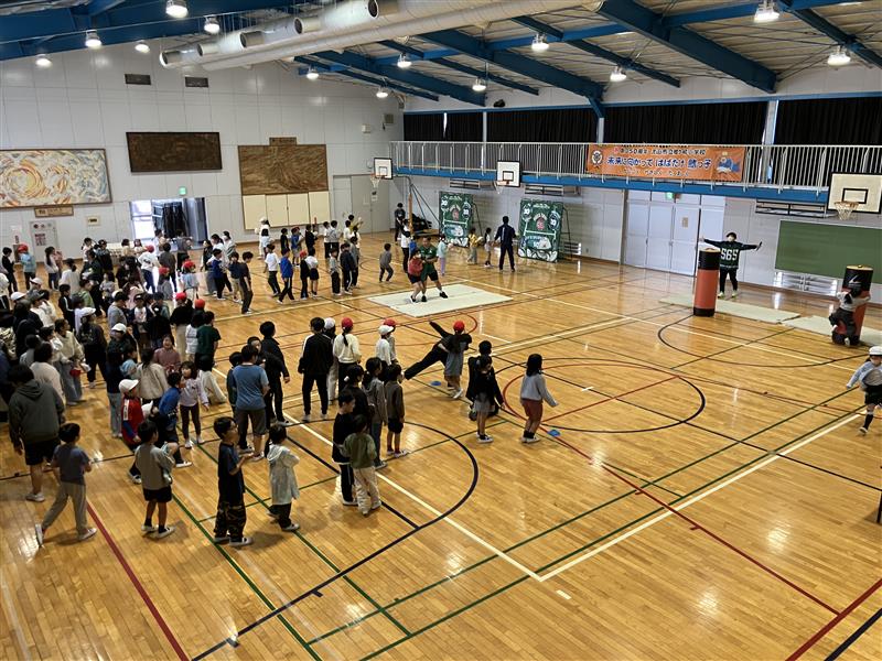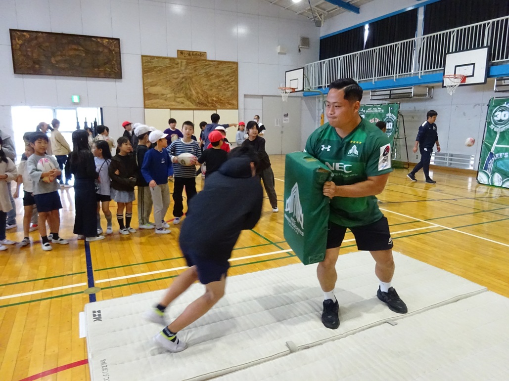 そして、給食後の休み時間では全校生徒を対象に体育館でラグビー体験を実施しました。