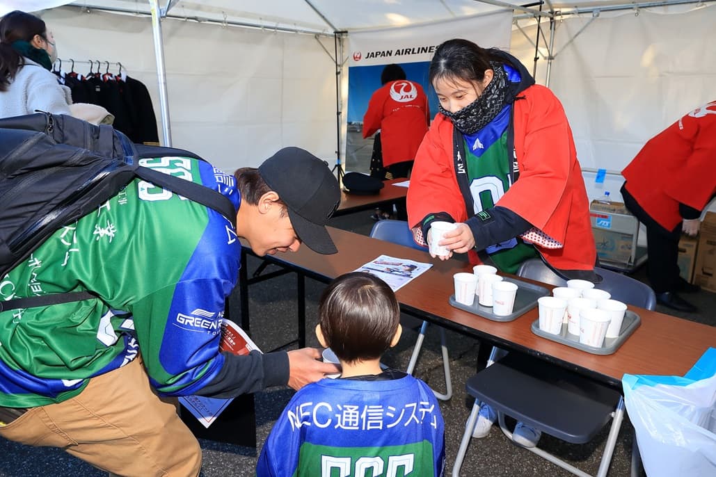 DNSブースでは、DNSプロテインの試飲会を実施!また、現地にてオンラインサイトで3,000円以上ご購入のお客様にNECグリーンロケッツ東葛選手のサイン入りグッズが当たるハズレなしくじ引きチャレンジを開催!