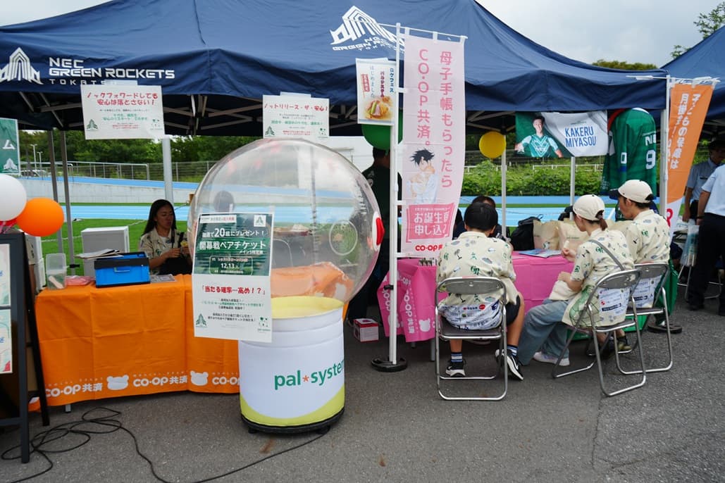 ・風で舞い上がるくじをキャッチする楽しい抽選ゲームで、チームグッズやパルシステム商品がその場