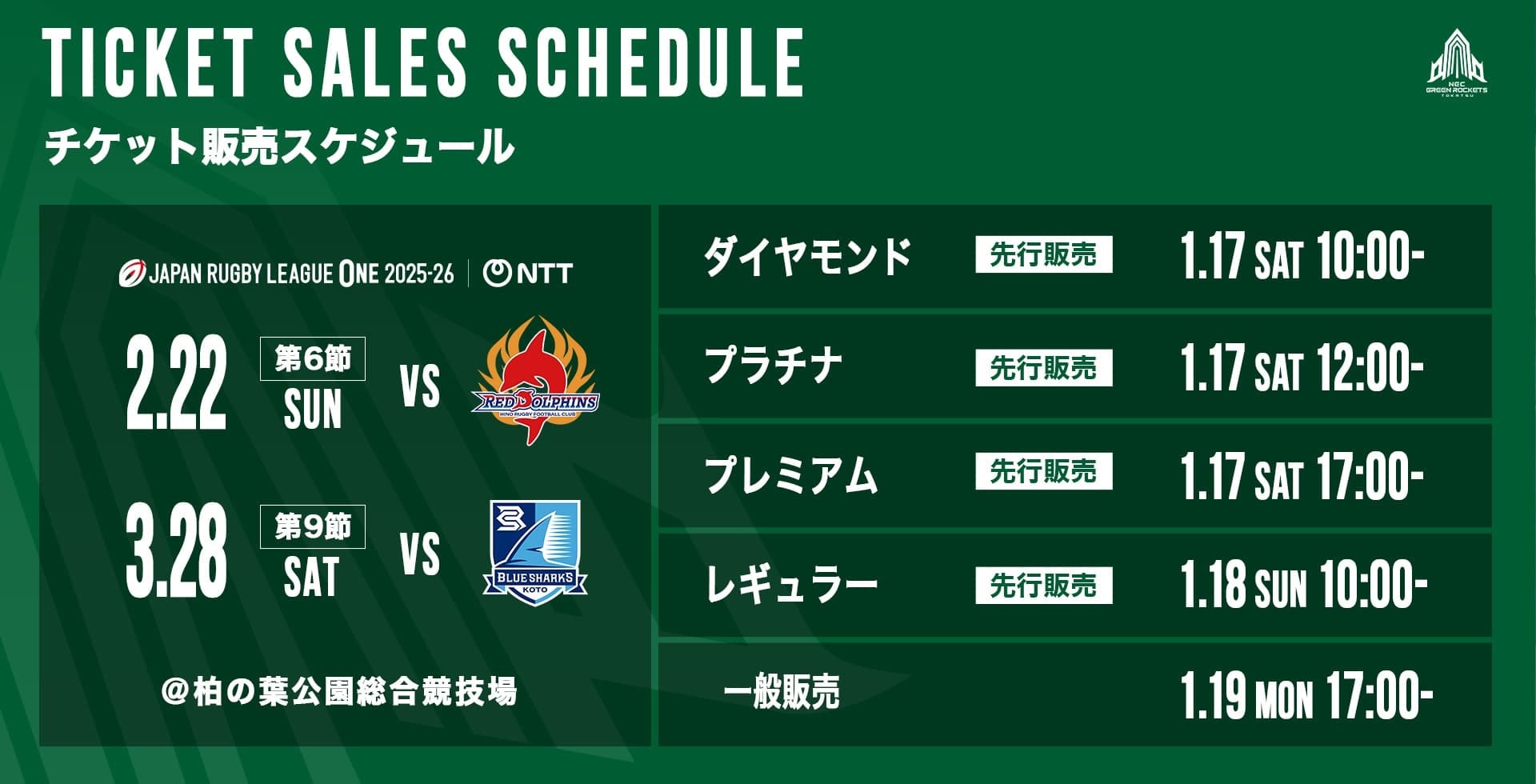 1月17日(土)より、以下第6節・第9節 柏の葉ホストゲームのチケットを順次販売開始いたしますのでお知らせいたします。