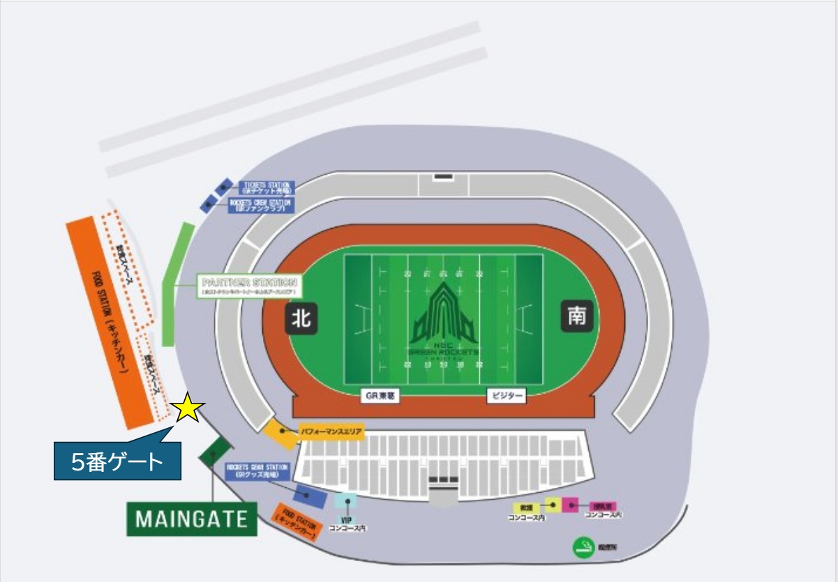入場場所:メインゲート前5番ゲート(図面黄色★印)