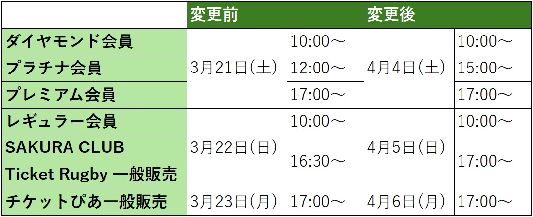当初、第1節12月13日(土)大阪RH戦と同じパターンAの座席配置を予定しておりましたが、一部座席設定の見直しを行ったため、下記のとおりチケット販売スケジュールを変更いたします。