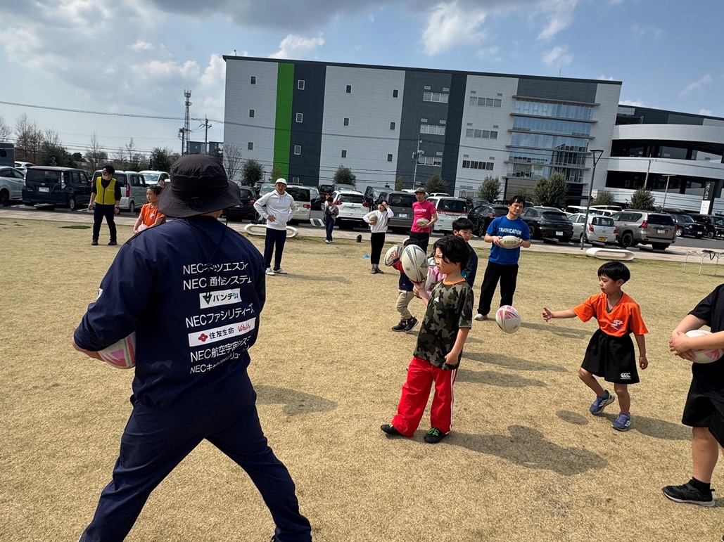 当日は飛び入り参加もあり、みんなでラグビーボールパスや生タックル、そして試合を楽しみました。