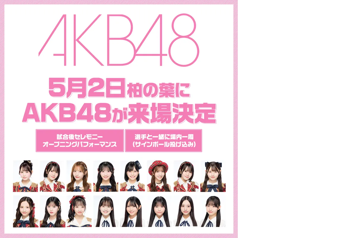 AKB48が柏の葉に来場し、「試合後セレモニーオープニングパフォーマンス」や「選手と一緒に場内1周(サインボール投げ込み)」を実施します。40周年ラストを飾る記念セレモニーを華やかに盛り上げて頂きます。
